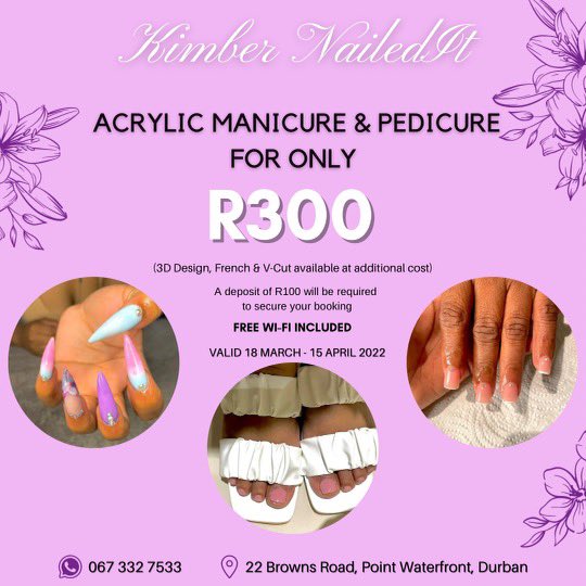 173 job offers for nail tech in Durban South Kwazulu Natal SHE Safety Officer FULCO PURPOSE OF JOB ROLE INTENT This position will render a service toward full. Windermere Road mid Feb.